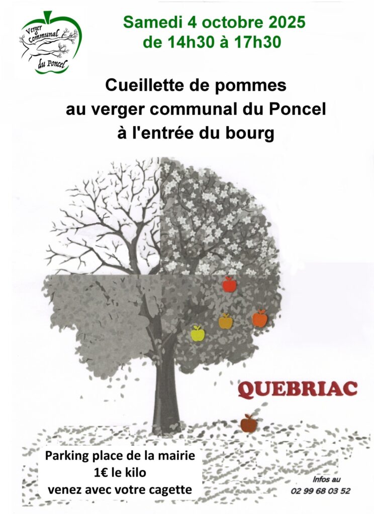 Le samedi 4 octobre, le verger communal du Poncel à Québriac et l’association Québri’ya’quoi, vous convient à la cueillette libre des pommes du verger. Ce sera de 14h30 à 17h30.