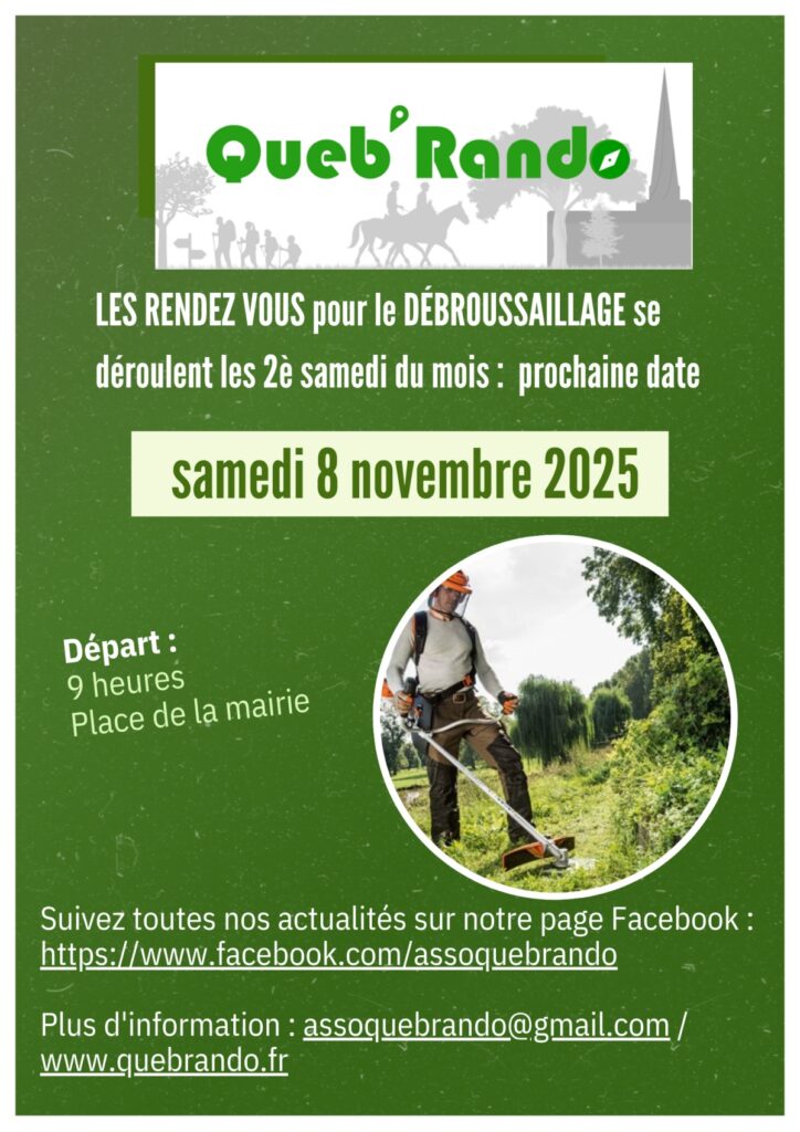 LES RENDEZ VOUS pour le DÉBROUSSAILLAGE se déroulent les 2è samedi du mois : départ 9h sur la place de la mairie de Québriac.