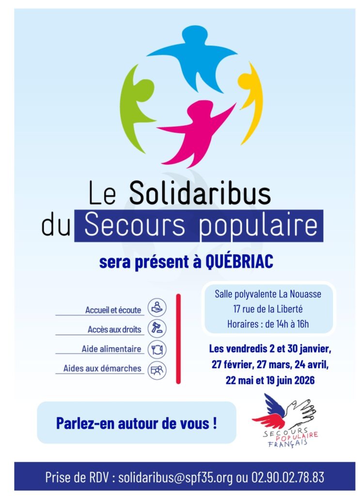 Les aides du Secours populaire sont accessibles à toute personne en situation de précarité, avec ou sans orientation d’un travailleur social. Pour toute demande de renseignements ou pour prendre rendez-vous pour le prochain passage du Solidaribus, vous pouvez joindre le Secours populaire par mail à solidaribus@spf35.org ou par téléphone au 02 90 02 78 83.