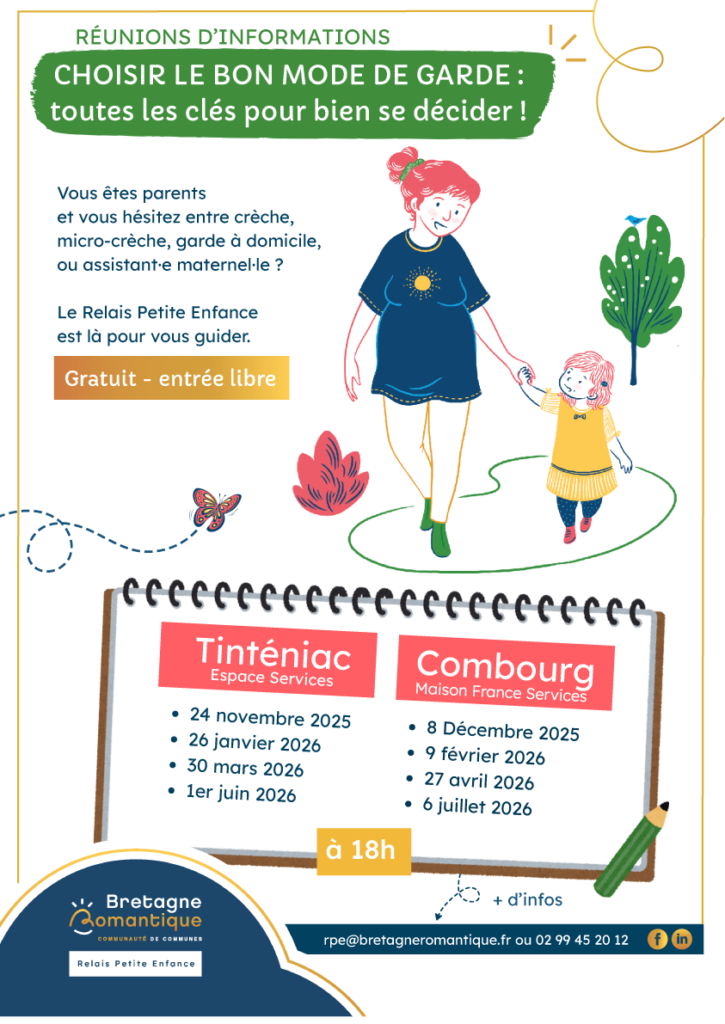 Pour toute question ou information complémentaire, vous pouvez contacter le Relais Petite Enfance : rpe@bretagneromantique.fr ou 02 99 45 20 12